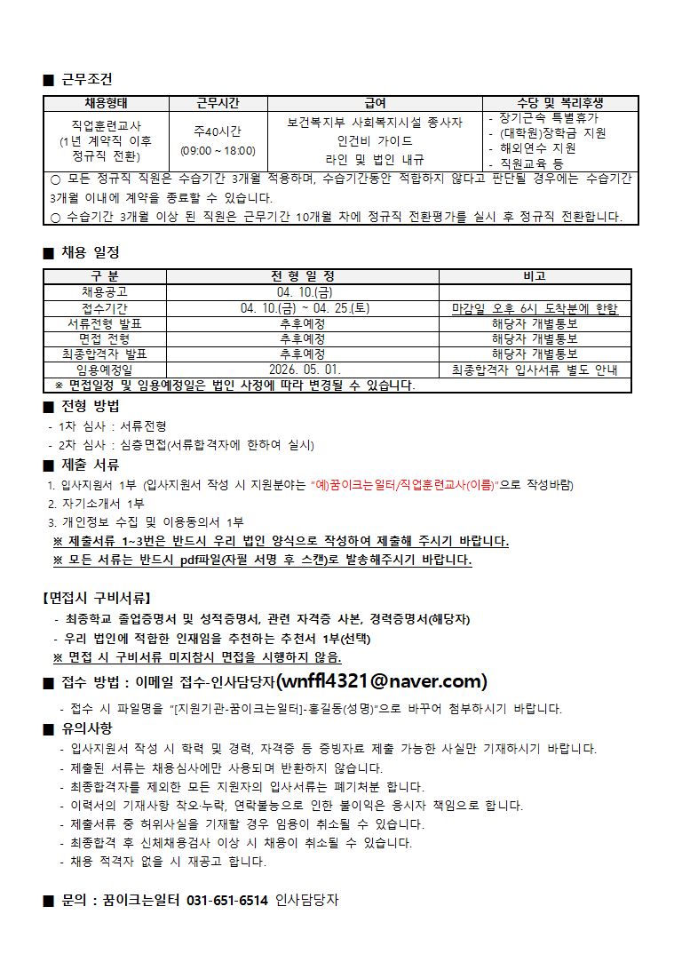 꿈이크는일터 공고 제2026-01호 직원(직업훈련교사) 채용공고 (2차)