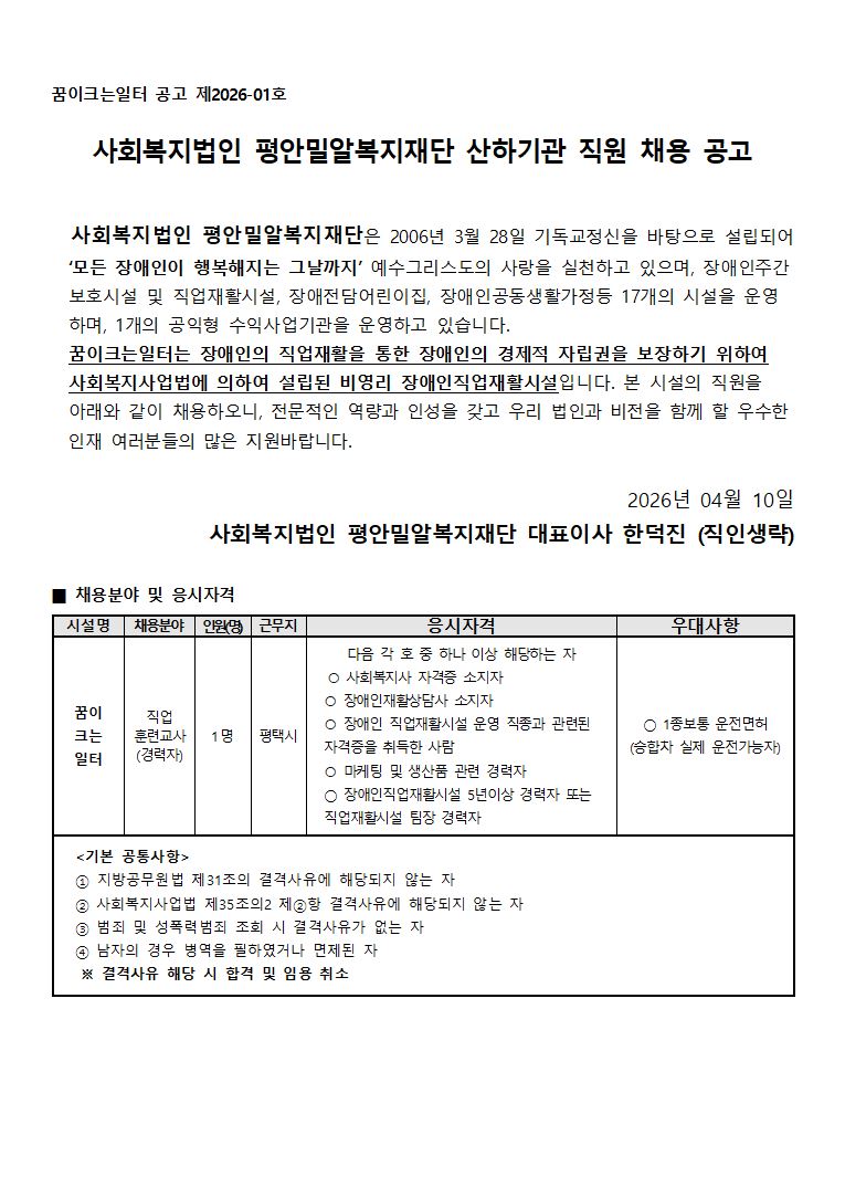 꿈이크는일터 공고 제2026-01호 직원(직업훈련교사) 채용공고 (2차)